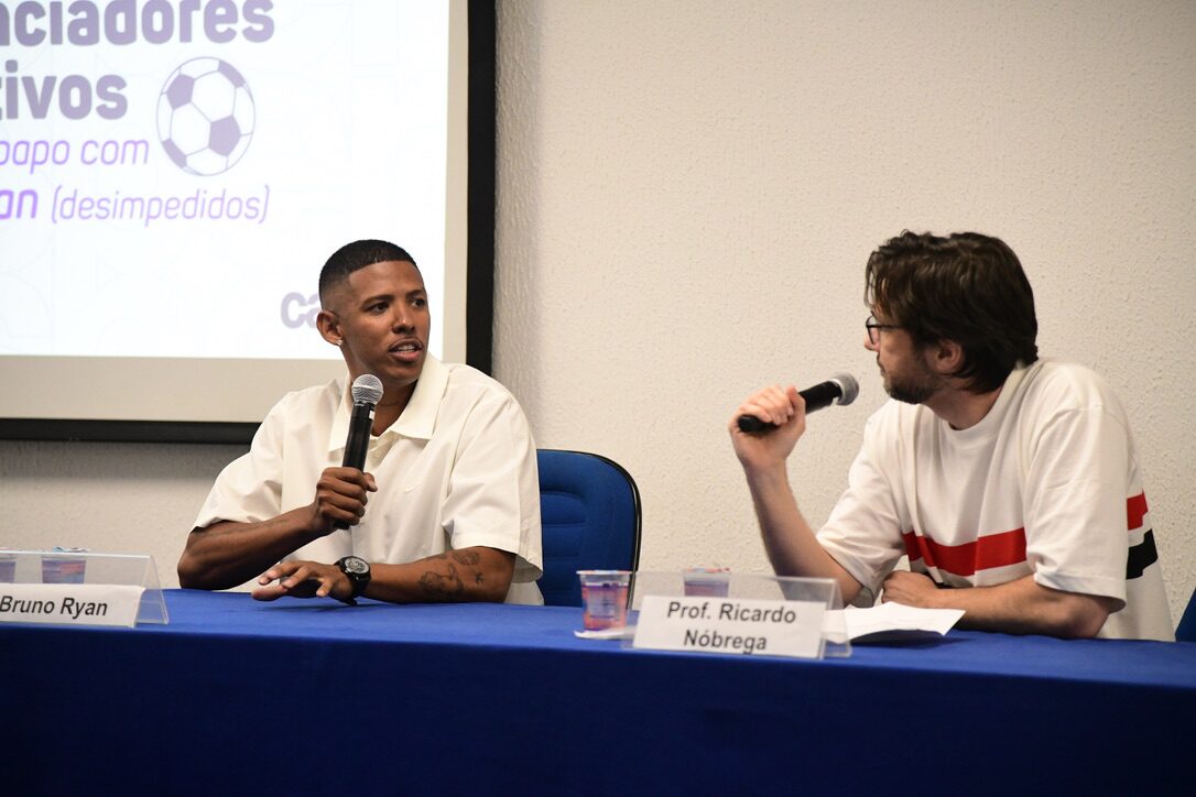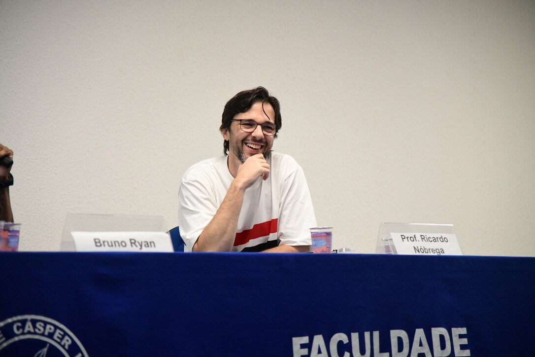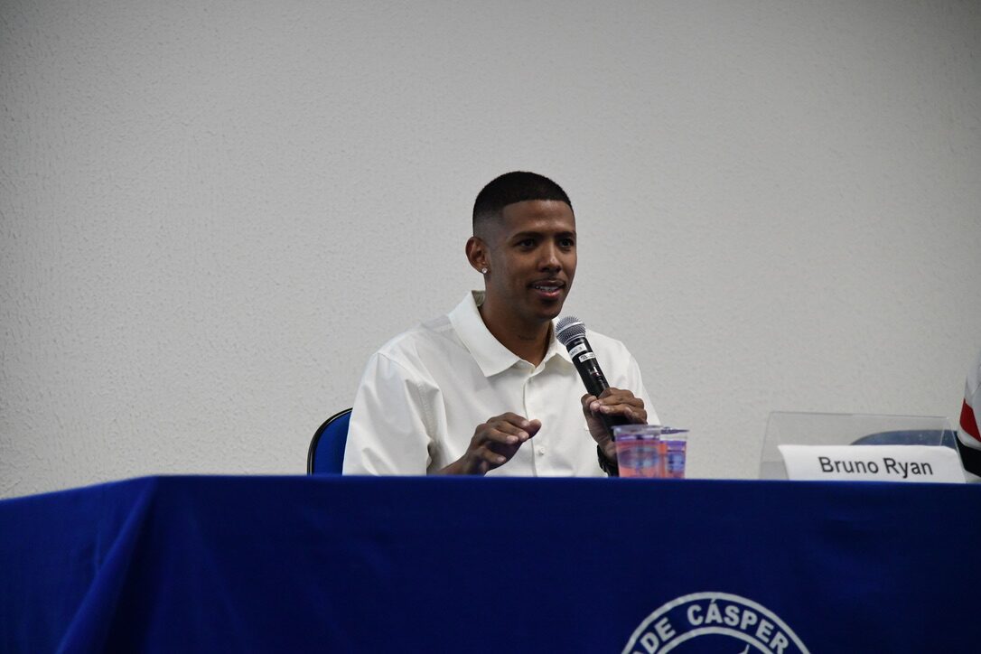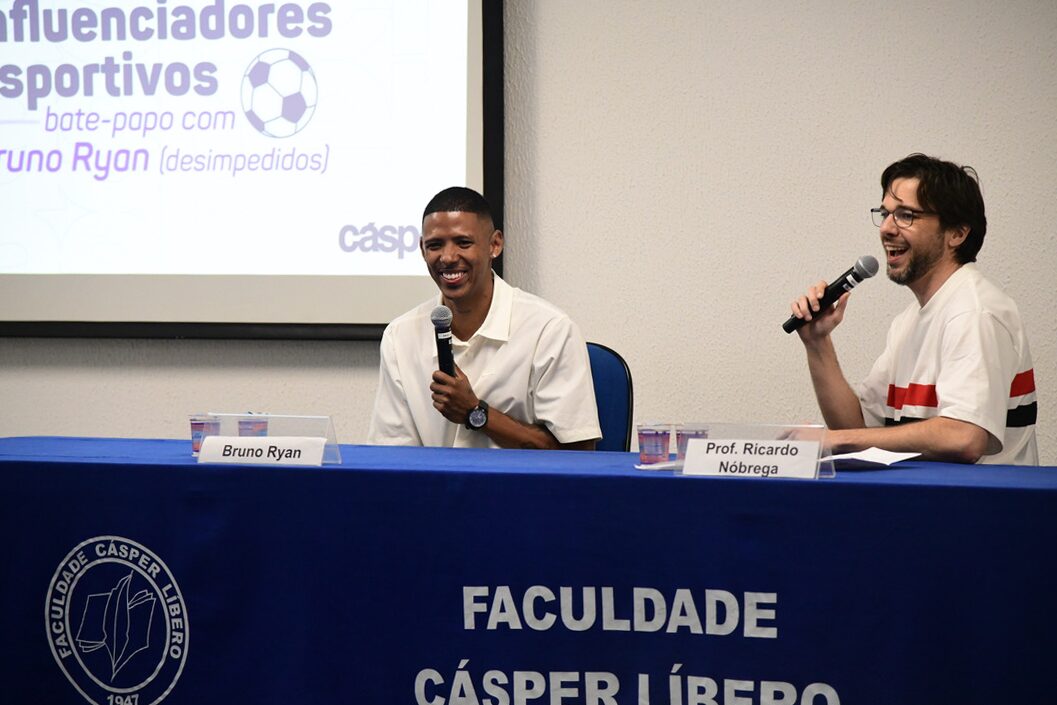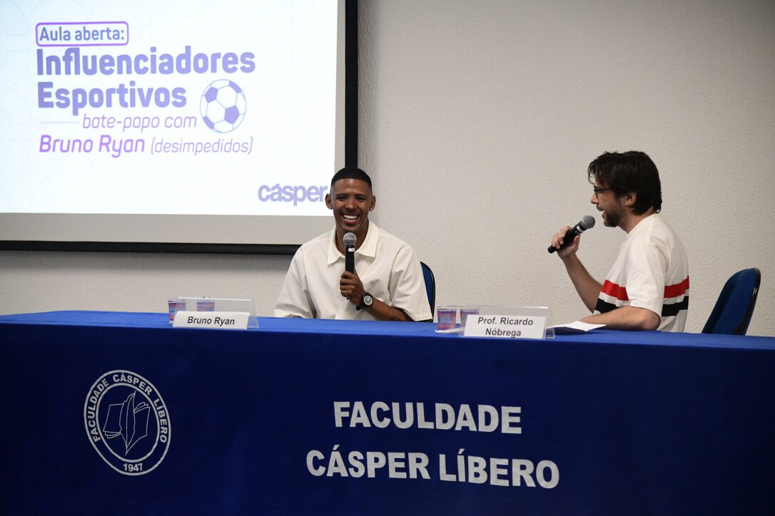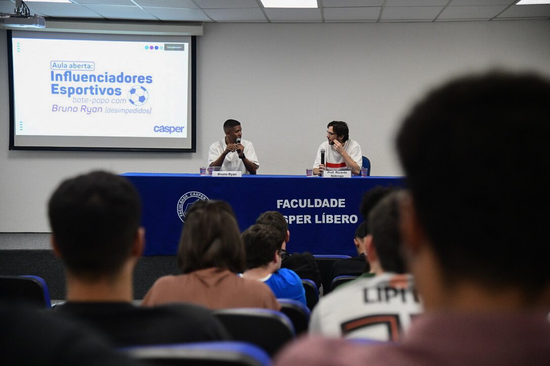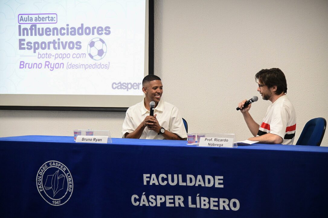 A Faculdade Cásper Líbero recebeu, no dia 02 de setembro, o influenciador digital Bruno Ryan, do canal Desimpedidos, para uma aula aberta sobre influenciadores esportivos. O evento, mediado pelo professor Riccardo Nóbrega, teve como propósito aproximar os alunos do debate acerca da produção de conteúdos nas redes sociais e o papel dos influenciadores digitais na comunicação.